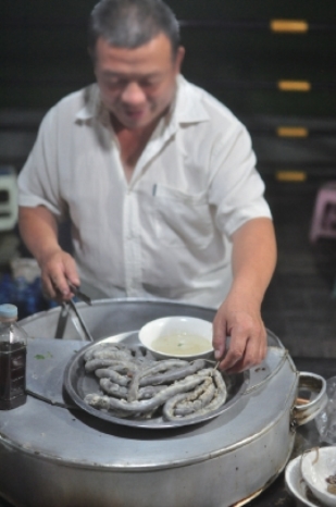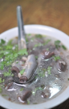 我爱吃肥肠,又喜食血旺,二者可以兼得者,东北有锅酸菜白肉血肠,福建同安有碗大肠血汤,贵阳有碗肠旺面,而在山东德州有一样小吃,叫羊肠子。名字虽然叫羊肠子,但确切来说,是羊血灌入羊肠,应该叫羊血肠才对,所以我很是喜欢。