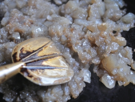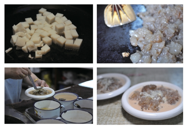 关于烟台焖子的来历是有传说的,说很多年前,烟台一对做粉坊的门氏兄弟,因为阴雨天粉条无法晾晒,恐其馊坏,无奈之下将粉团切块油煎、调味,不料风味尤胜粉条,从此当地人便把这种小吃以兄弟俩的姓氏谐音冠为“焖子”。这种传说,我是不太信的,我倒是觉得这一定是民间百姓的智慧,无意中发现美食的智慧。而且“焖子”一名应该从其油煎烧焖的制作方式而来才更符合情理。