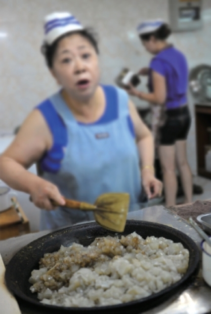 后记:这篇稿子我在微博发过,有太多人转发、评论,有认识胖大嫂的烟台网友去她店里吃焖子就给她看,大嫂还专门注册了一个微博号上网留言约我再去烟台,去她家吃焖子。去年带山东电视台拍美食纪录片,又去烟台,拍摄之余去寻找胖大嫂的焖子,不料已经搬家了,辗转打听,终于在奇山市场找到了她的店儿,胖大嫂的丈夫退休了,在帮她一起做,打电话后胖大嫂赶了过来。大嫂瘦了好多,但热情依旧,焖子,美味依旧,那把用了几十年的小铜铲子,依旧在做着炒焖子,见证着胖大嫂的青春还有岁月……