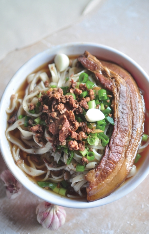 苏州有种面,叫焖肉面,我很是喜欢。逯耀东先生曾经在他的文章《寒客夜来》中有一段极其诱人的描述:“那的确是一碗很美的面,褐色的汤中,浮着丝丝银白色的面条,面的四周漂着青白相间的蒜花,面上覆盖着一大块寸多厚的半肥瘦的焖肉。肉已冻凝,红白相间,层次分明。吃时先将肉翻到面下面,让肉在热汤里泡着。等面吃完,肥肉已经化尽溶在汤里,和汤喝下,汤腴腴的咸里带甜。然后再舔舔嘴唇,把碗交还,走到廊外,太阳已爬过古老的屋脊,照在街道上颗颗光亮的鹅卵石上。这真是一个美好又暖和的冬天早晨。”