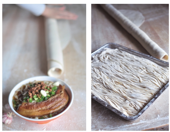 而大肉面的面呢,一定要是手擀面,讲究的是面要和得筋、饧得透、揉得够,还要讲究擀得薄、切得宽。在案板上,撒一把面,把和好的面团揉搓得紧实有劲儿,用一支擀面杖一遍一遍地擀成一张薄薄的大大的圆圆的面皮儿,再一层层折叠起来,挥利刃,切成宽宽的面条,一抓一抖,就成了一把把宽长、筋道、顺滑的手擀面条了。
