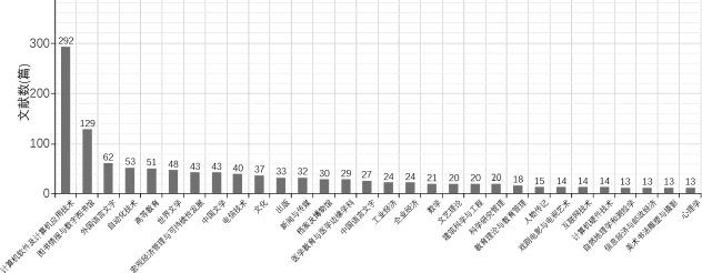 从学科领域的分布情况来看(见图3),同国内数字人文研究相比,国外数字人文所涉及的学科方向更广,研究主题更丰富,各学科的研究力度更为均衡[16]。从数字人文国外文献的引用情况来看,被引频次较高的论文大多发表于数字人文研究的早期阶段。“被引排名第一的文献为‘Enabled Backchannel:Conference Twitter Use by Digital Humanists’(Ross et al.,2011),该文将推特视为数字人文领域的反馈方式,探究由推特驱动的反馈对学术会议体验、合作和知识共建的提升作用。被引频次排名第二的为‘Mapping the English Lake District:A Literary GIS’(Cooper et al.,2011),该文探索了使用GIS在地图上标注定性数据理论可能性和方法。”[17]