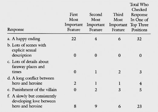 拉德威的定量方法一开始似乎与熟悉的远读例子相去甚远。她不讨论算法。相反,她只是用数字来计算和比较。例如,为了问“一部浪漫小说的哪些元素最被读者看重?”(见图1)。最近的远读例子可能会变得比这更复杂。但它们也可以保持同样简单。弗兰克·莫雷蒂依靠书目来衡量体裁的寿命。我向读者询问了他们对94部小说中过去时光的印象。