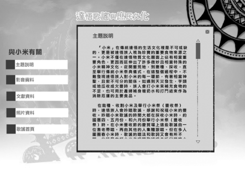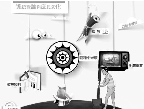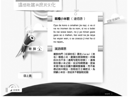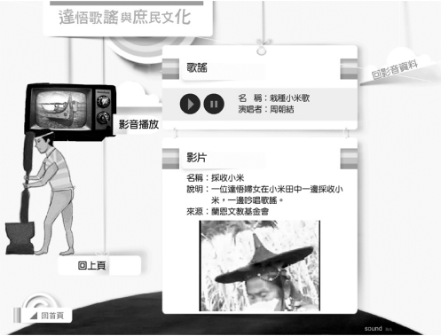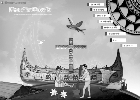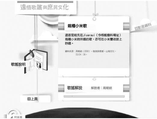 为给使用者提供多个查询或了解达悟歌谣的渠道,研究者为达悟歌谣规划了专属网站(http://lanyu.nctu.edu.tw/songs/,见图2),以主题的方式呈现达悟歌谣的相关信息。此外,为吸引大家对歌谣的注意力,此网站以较活泼的色彩与方式来呈现歌谣数据,并强调以交互式来了解达悟歌谣的精髓。换句话说,有别于多数的数字典藏较制式之视觉风格,此网站以大量图像作为接口设计,并加入丰富的用户互动模式以及让浏览者身临其境的背景歌谣原音呈现,希望借由亲和性的设计,拉近与浏览者之间的距离,使他们能在轻松愉快的过程中了解数字典藏网站上的丰富资料。
