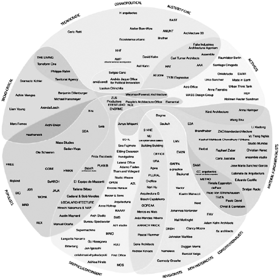 “谱系学”概念来自哲学思想。谱系学方法源自福柯,强调研究历史文献,注重研究对象的“被构成意义”及其“相互关系”,即“谱系关系”。谱系学研究方法更注重错综复杂的客观联系,而非线性规律。关注建筑师和建筑思想知识发现的研究有:1995年日本东陶出版社的《世界581名建筑师》,在时代语境中展现建筑师群体的相关性,以及与世界建筑文化的波动性。此外,2017年上海城市空间艺术季(SUSAS)由美国普林斯顿大学亚历杭德罗·扎拉波罗(Alejandro Zaera-Polo)展示的装置作品《全球建筑实践罗盘》,勾勒了21世纪新兴建筑学实践背景下的全球建筑实践的聚类图谱(图2)。