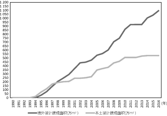上海的建筑师具有丰富多元的文化背景,境外建筑师和国际建筑事务所众多,主要来自:美国、加拿大、日本、德国、新加坡、法国、英国、意大利、澳大利亚、瑞士、西班牙等国家和地区。上海浦东新区陆家嘴开发公司在1990年至2016年建成的200个建筑项目中,98项由境外建筑师完成,项目总建筑面积是本土建筑师完成的两倍(图3)。根据中国建筑学会2016年的统计,我国有一级注册建筑师32 542人,二级注册建筑师19 171人,占全国人口比例为1/37 620;而美国建筑师占总人口的1/1 429,西班牙为1/915,德国为1/789,全球比例最高的意大利建筑师占总人口的1/414。从国内建筑师占人口比例现状可以看出,境外建筑师在中国依然具有很强的竞争力。另据美国建筑师协会(AIA)统计,美国建筑师事务所中约70%有境外项目设计经验,30%是国际建筑事务所。