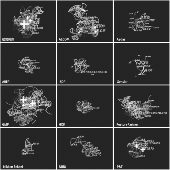 基于上述重点期刊、文献关键词和主题词形成基于境外建筑事务所的实践图谱,包括:Aecom、Aedas、Arep、BDP、Gensler、GMP、HOK、Foster+Partner、Nikken Sekkei、NBBJ、P&T。图谱以文献关键词的相关度为点到线的连接,较多的数据可形成知识域,进一步形成知识生产维度中围绕特定建筑师及其群体的实践话语知识图谱(图5)。