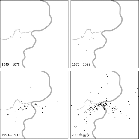 据学术期刊文献史料梳理统计,1949年以来上海建成境外设计项目184项,其中20世纪50年代境外设计项目1项;80年代建成的境外设计项目6项;90年代建成的境外设计项目显著增加,共计47项,占比25.5%;2000年至2010年建成的境外设计项目共117项,占比63.6%。从发展趋势上看,21世纪前十年上海建成的境外建筑设计项目超过1949年至1999年50年间所有境外建筑设计项目总和。另从分布统计数据看,上海的境外建筑设计项目主要分布在浦东新区、黄浦区、静安区、徐汇区、长宁区、杨浦区、闵行区、闸北区、普陀区、虹口区、青浦区、松江区、嘉定区等。其中,浦东新区境外建筑设计项目占比39.1%,上海中心城区分布的境外建筑设计项目占比93.5%,时间分布演变可间接反映出上海在不同时期城市发展战略的趋向(图4)。