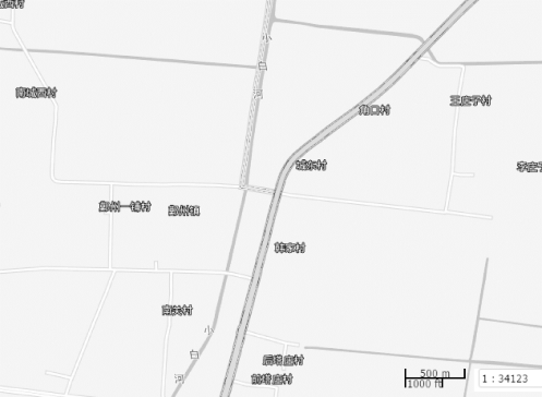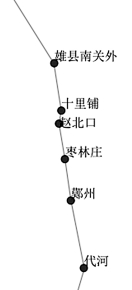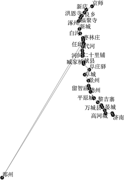 《日记》记载姚鼐乾隆三十三年七月二十五日“天明行约十余里,登岸,至枣林庄。复乘舟十里,至郑州。水路穿城而出南门,乃舍舟从陆……又三十里,至任邱”。在可视化过程中,行迹图上“郑州”这一点突然波折(见图3)。姚鼐一日之内行迹绝不会跨度如此之大,此处明显存在问题。《日记》所载的“郑州”介于“枣林庄”与“任邱”之间,以此为线索,细细查看行迹图,两地之间有一地名“鄚州”,且此地有条小白河南北穿城而过(见图4、5),与《日记》记载相符。繁体“郑”字与“鄚”字形似,加之姚鼐字迹“爽迈飘逸”,故此处“郑州”乃是“鄚州”之讹。