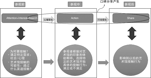 (3)接触行为:参观者根据对艺术馆的印象和体验期待,人们选择特定的艺术馆开始具体的接触行为。