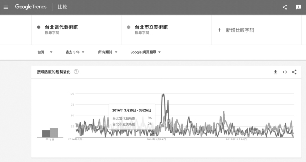 台北当代艺术馆举办的“蜷川实花展”是世界巡回的首站,据雅虎新闻报道,“蜷川实花展破12万人,创展馆15年纪录”[6],展览最后一天仍大排长龙。展览的成功除了艺术家本身的魅力以外,也归功于互联网的发达。移动网络与智能手机的数字化媒介的普及,使得一个事件得以在网络的世界里充分发酵。台北当代艺术馆从展览前的预热、展览中的活动与议题讨论、展览后的发酵都在社交媒体上主动出击,一方面炒热话题、促进票房,另一方面也提升了台北当代艺术馆的声誉和关注度。本研究使用谷歌趋势(Google Trend)搜索关键词“台北当代艺术馆”和“台北市立美术馆”两个场馆做比较(同为台北市艺术场馆),台北当代艺术馆于2016年蜷川实花展览期间的搜索流量冲至最高点100分(见图2)。