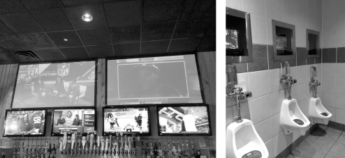 图13 安娜堡Buffalo酒吧前台、卫生间里大大小小的屏幕