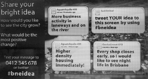 麦库姆斯和肖曾在议程设置理论之后提出议程融合论,把议题融合看作是一个社会传播的过程,认为团体议题、媒介议题和受众议题共同构成了社会公共议题,团体议题是社会问题的源头,媒体对团体议题进行选择过滤,受众议题是最终出口。随着媒介环境的变化,受众议题可以绕过团体议题、媒介议题,直接接触、博弈、融合,达到社会整合的目的[29]。2012年澳大利亚一项“数字媒体与交互城市”的实验项目,就是让公众通过SMS或Twitter,以发送屏幕弹的方式将自己终端屏幕的讯息发送到公共屏幕,这块公共屏幕可以在城市建筑体上,也可以安置在办公场景中。屏幕界面分为左右上下格局,右侧中心界面可以是城市、组织和媒介设置的主要议题,但是随时欢迎公众匿名将自己的反馈、观点和议题发送到屏幕上(见图16)。这样这块公共屏幕就促成了城市与民众议题的连接和互动,为受众议题提供了即时的、场景的、现实的出口,将受众舆论与组织团体议题或媒介观点以眼见为实的方式碰撞和融合,以更加真实和民主的方式推动了市民与城市之间的有效沟通。