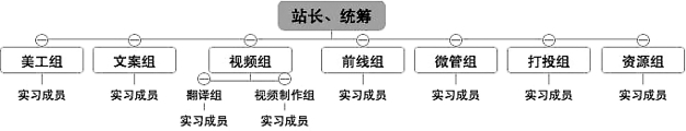 一个较为完整的101粉丝站内部结构往往分为三个层级(如图2):以站长和统筹为核心的高层,主要负责整体决策和统筹,以及与其他粉丝站之间的联系;各个部门分管组长,参与高层的策划,并负责分配任务;各个部门的组员,主要负责执行工作。其中,美工组、文案组和视频组主要负责制作图片、文案和视频,前线组负责偶像活动现场的拍摄工作,资源组负责从网上抓取相关的图片视频等资源,微管组负责粉丝站在各大社交媒体上的账号运营,打投组负责组织投票、打榜、数据监控等工作。
