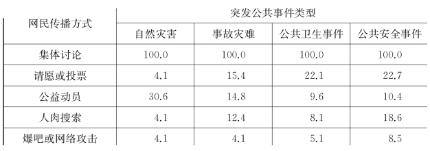 分析各类突发公共事件中网民传播方式分布情况,卡方检验结果表明,不同类型事件中网民采用的传播方式存在差异(χ2=49.282,p=0.000<0.05)。由表1可知,公共安全事件、公共卫生事件相比其他类型事件更容易引发网民请愿或投票传播;自然灾害、事故灾难则更容易引发网民公益动员;人肉搜索现象在公共安全事件、事故灾难中相对突出;网民爆吧或网络攻击行为在公共安全事件中最为明显。