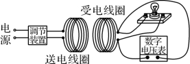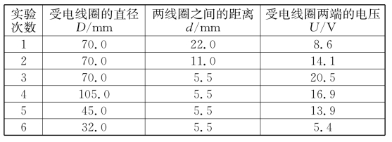 (3)在图中的电源、调节装置和送电线圈不改变的情况下,该小组同学想探究影响受电线圈两端电压大小的因素,猜想它可能与受电线圈的匝数、直径及两线圈之间的距离有关。接着,他们用相同规格的漆包线绕制了多个匝数相同、直径不同的线圈进行探究活动。实验数据如下表所示:(其中送电线圈直径为70.0mm)