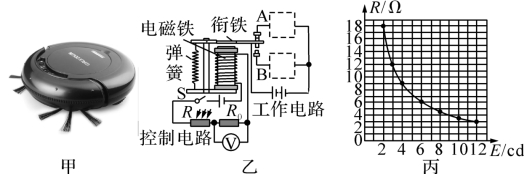 17.(2021·乐清)(10分)智能家居已经悄然走入我们的生活,智能扫地机器人(如图甲)可通过灰尘传感器自动寻找灰尘清扫,通过电动机旋转、产生高速气流将灰尘等吸入集尘盒。智能扫地机器人的工作原理可简化成图乙。当地面灰尘增多,空气的透光程度减弱,使照射到光敏电阻上的光照强度减弱,改变电磁铁的磁性,从而达到自动控制工作。控制电路电源电压为6伏,定值电阻R0=14欧,R 为光敏电阻,其阻值随光照强度E(单位cd)的变化如图丙所示。线圈的阻值忽略不计。
