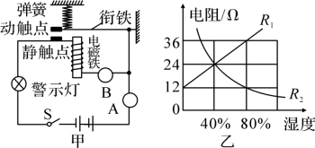 (3)闭合开关,警示灯发光,当湿度达到40%时,衔铁被吸下来,导致串联在图甲________(填“A”或“B”)位置的湿敏电阻被短路,警示灯发光较亮,此时因电磁铁突然失去磁性,在弹簧作用下,动、静触点分离,警示灯发光较暗,如此循环,实现了不断亮暗闪烁。