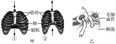 (2)图乙中A表示____________(填写气体名称),其通过________作用,透过毛细血管壁和肺泡壁进入肺泡内。