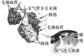 16.图示表示的是人体肺的结构及肺泡与血液间的气体交换,下列描述中错误的是 ( )