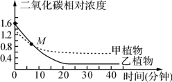 20.将长势一致的甲、乙两种植物分别置于两个同样大小密闭的透明容器内,给予充足的光照、适宜的温度等条件,每隔5分钟测定一次容器内的二氧化碳浓度,结果如图所示,下列有关叙述错误的是 ( )