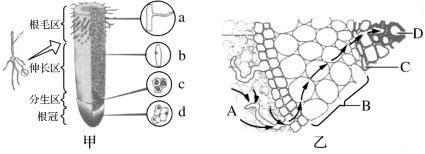 (1)根的伸长与图甲中________(填字母)两类细胞的生理活动有关。