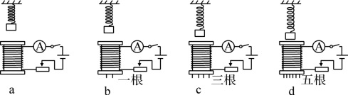 28.为了探究通电螺线管的磁性强弱与哪些因素有关,某小组同学利用一个螺线管、几根完全相同的铁棒及其他器材进行实验。实验时,先把螺线管固定在连有弹簧的铁块下方,并将其接入电路,闭合开关,移动滑片,使通过螺线管的电流为某一数值,弹簧略有伸长,出现如图a的现象。接着他们分别在螺线管中插入数量不同的铁棒,重复上述实验,每次实验电流表示数均相同,现象分别如图b、c、d所示。请回答: