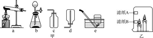 (2)将高低不同的蜡烛点燃,盖上烧杯后高处的烛焰先熄灭。小明同学提出假设:高处的二氧化碳浓度比低处的大。于是设计了如图乙装置进行探究(滤纸用氢氧化钙溶液湿润,并滴加无色酚酞,酚酞遇碱性的氢氧化钙溶液变红色)。如果小明的假设合理,则待蜡烛熄灭后预期的实验现象是______________________________________________________________________。