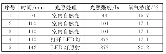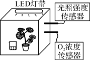 24.兴趣小组利用如图装置研究植物的光合作用强弱,在透明塑料箱内部上方安置一盏LED照明灯,在箱中放入天竺葵和装有碳酸氢钠溶液的烧杯(提供二氧化碳气体),利用光照强度和氧气浓度传感器采集相应数据。先在室内自然光照下进行实验,于110分钟时打开LED灯带,连续获取实验数据,记录如下表。