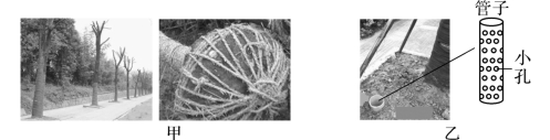 26.据温州新闻网报道,温瑞大道改造需移栽路边行道树,农林人员将树木“剃头”处理,树木移栽过程中在根部保留一定量的土壤(图甲)。干燥晴朗天气,选择傍晚进行移栽,同时适当浇水。在多雨天气时,移栽至黏土类土壤中的树木,农林人员会在根的边上插入多条布满小孔的特殊“管子”(图乙),每天农林护理人员利用抽水机抽取“管子”内的积水。请你结合科学知识,解释上述移栽树木中多种处理方法能提高成活率的原因。