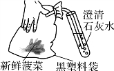 13.小科将数棵新鲜菠菜装入黑塑料袋密封,在暗处放置一个晚上。按图所示,松开塑料袋口,插入一根导管,让塑料袋中的空气通入澄清石灰水。该实验 ( )