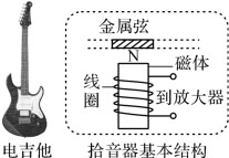 17.2021年4月,“中国好声音”云和赛区的海选现场,吉他手用电吉他弹奏乐曲。电吉他发音是通过拾音器(如图所示)来实现的。磁体产生的磁场会使某些金属弦被磁化。当金属弦被拨动而产生振动时,相当于线圈相对金属弦做运动,使线圈产生电流,此电流通过放大器和扬声器发出声音。