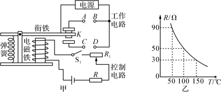 29.如图甲是一个简单恒温箱温控电路图,由热敏电阻R、滑动变阻器R1和电磁继电器等元件组成,图乙为热敏电阻的R-T 图像。当恒温箱的温度升高到50℃时,线圈的电流达到一定值,使继电器的衔铁被吸合,从而实现控温。