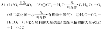 28.(1)呼吸 (2)二氧化碳(CO2) (3)植物光合作用制造了有机物(淀粉),当光合作用强于呼吸作用时,碘遇剩余的淀粉变蓝色(2分,只写光合作用得1分)