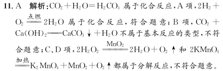 11.A 解析:1个甲醛分子是由1个碳原子、2个氢原子和1个氧原子构成的,故甲醛分子中碳、氢、氧原子个数比为1∶2∶1,A正确;甲醛由甲醛分子构成,分子由原子构成,甲醛分子由碳、氢、氧三种原子构成,B、D 错误;相对分子质量单位是“1”,不是“克”,常省略不写,C错误。