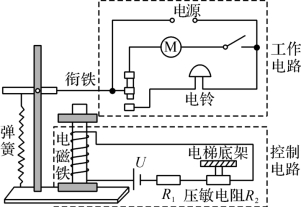 (2)解:电梯厢内站立总质量为1000kg的乘客时,电梯受到的压力等于乘客的重力,即F=G=mg=1000kg×10N/kg=1×104N;由题图乙可知,当压力F=1×104N 时,对应的压敏电阻阻值R2=100Ω,因串联电路中总电阻等于各分电阻之和,则控制电路中的电流:0.03A=30mA;因30mA>20mA,所以此时电梯超载。