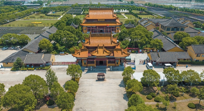金碧辉煌的主殿与杏墙黛瓦的厢房组成的建筑群体,气象万千。寺前广场上矗立的一座四柱牌坊及两侧的镂雕龙凤石柱巍峨壮观,牌坊中柱高十一点六米,两侧镂雕龙凤石柱高九点七米。入牌坊往东,为天王殿及大雄宝殿。天王殿面阔五间,内深四界,高十六点六米。大雄宝殿气势雄伟,面阔七间,内深六界,高二十一米,位于露台之上,画栋雕梁,高大恢宏。主殿右侧厢房依次为念佛堂、极乐堂、祖师堂、功德堂;左侧厢房依次为客堂、延寿堂、监察室。殿宇区东部为寺庙生活区,有综合楼、斋堂、餐厅等,同时设置较多绿化用地。