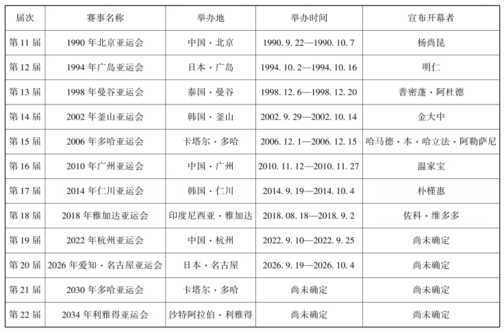 从以上表4-1的历次亚洲夏季运动会一览表来看,今天的亚运会,在历经了几十年的风雨与辉煌之后,已成为亚洲规模最大、水平最高的体育盛会。同时,也成为亚洲各国各地文化交流、友谊传承的绚丽舞台。