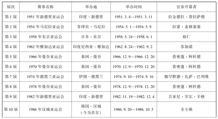 1951年3月,在印度首都新德里举行的第1届亚洲运动会上,只有11个国家和地区参加,运动员人数为489名,比赛项目为6个。后来随着运动会的有序进行,参加比赛的国家和地区就逐渐增多,参赛运动员人数和比赛项目也逐渐扩大,到了2010年11月在广州举行的第16届亚运会时,参赛国家和地区已达45个,参赛运动员人数也达10 156人,比赛项目也增至42个大项,56个分项,463个小项。以下为历届亚洲夏季运动会的详情(表4-1)。