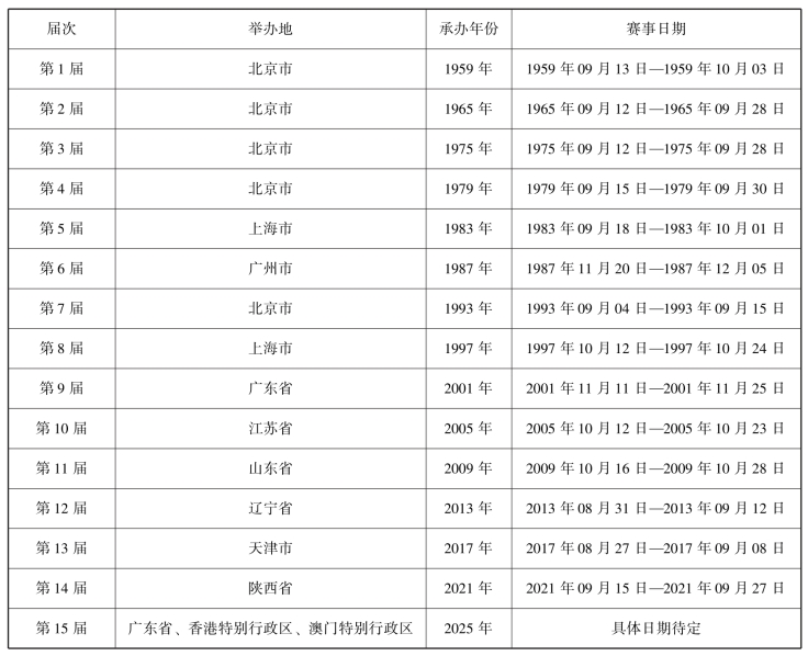 中华人民共和国全国运动会,简称“全运会”,是中国国内水平最高、规模最大的综合性运动会。中华人民共和国成立后,经过十年的艰苦奋斗,体育事业欣欣向荣,蒸蒸日上。为此,中央人民政府决定于1959年在北京举办第1届全运会。全运会每四年举办一届,一般在奥运会结束后的一年举行,至今已经举办了14届。全运会的比赛项目设置,除武术之外,基本与奥运会相同,其原意是为国家的奥运战略锻炼新人,选拔人才。为了调动各省市区的积极性,在1996年奥运会前,国家体育总局出台了“将奥运会奖牌带入全运会”的举措。