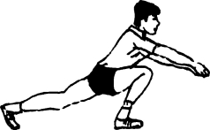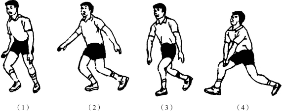 如向前移动,则后脚用力蹬地,前脚向前跨出一大步,膝部弯曲,上体前倾,身体重心移至前腿上(图8.2.4、图8.2.5)。