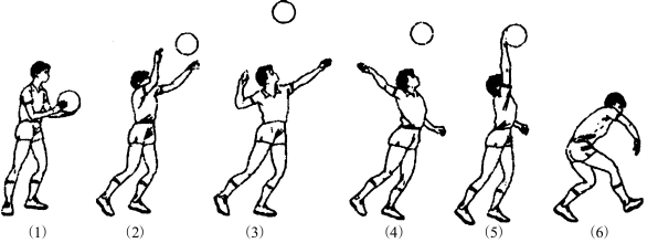 (2)击固定球练习:练习者两人一组,一人持球于头前,另一人挥臂击球。