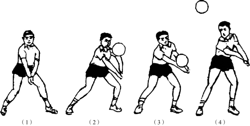 (2)两人一组垫固定球:一人双手持球置于体前较低处,一人做垫固定球练习。