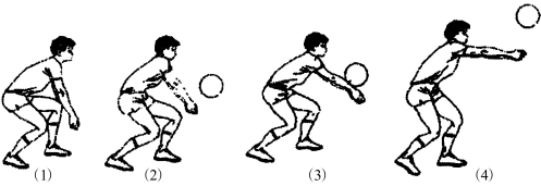 垫球是利用双手小臂形成的垫击面,在腹前垫击来球的技术动作,是最基本的垫球方法。主要用来接速度快、弧度平、力量大、落点低的各种来球,如接发球,后排防守,有时也用来做调整二传。其技术环节可分为准备姿势、击球手型、击球用力几个部分(图8.2.10)。