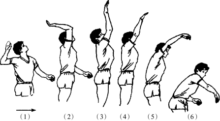 起跳后,右臂向前上方抬起,身体成反弓状。挥臂击球时,利用收腹开始发力,带动肩、肘和小臂及手腕成鞭打动作向上方挥击。击球点在身体右肩前上方,击球时用全手掌包住球,击球的后中部,并有压腕和推压动作,使球成上旋飞行。
