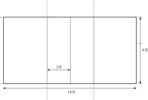 排球比赛场地包括比赛场区和无障碍区。比赛场区为长18米,宽9米的长方形,其四周至少有3米宽的无障碍区,从地面量起至少有7米的无障碍空间。国际比赛的场区边线外的障碍区至少5米,端线后至少9米,上空的无障碍空间至少12.5米(图8.3.3)。