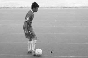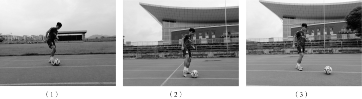 动作要领:支撑脚膝关节微屈并始终领先于球位于侧前方,踢球脚抬起用脚内侧推球前进,然后运球着地(图9.3.8)。