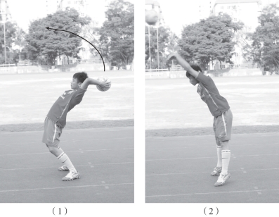 要领:双手持球,球必须举至头后,双手同时用力,双脚都不能离地,出球要过额头前方才能离手,动作具有连贯性,中途不能有停顿动作(图9.3.12)。