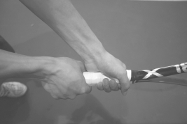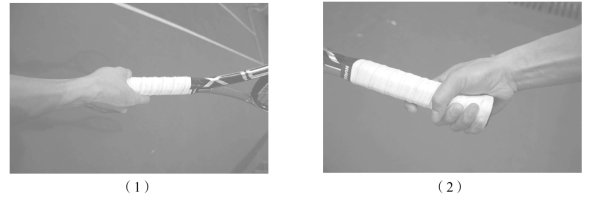 要领:在正手握拍的基础上,右手握拍柄底部,左手握右手上方(图10.2.2)。