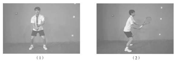 (1)准备姿势:两脚左右开立,左脚稍前,双膝微屈,双手握拍,拍置于体前。